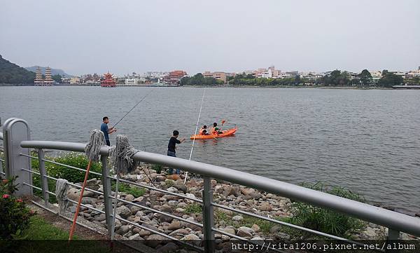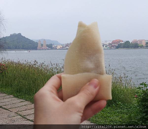沒幾分鐘就拿到了,店家沒內用區,但在對面(照片右側)有小公園可以吃,可我們去了蓮池潭~
