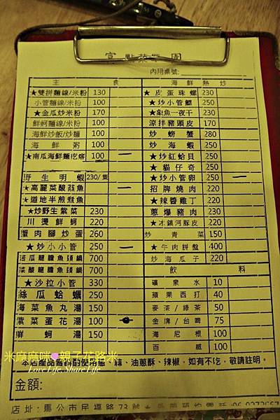 外表是不起眼的小吃店,但卻是在地人一致推薦的好滋味!富園海鮮菜單,清一色的海鮮料理,打星星的部分是老闆特別推薦