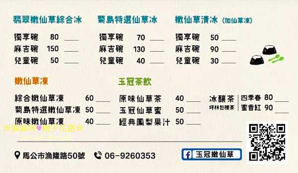 澎湖的人氣名店,由於仙草冰的配料豐富、仙草十分濃郁,因此遠近馳名,被譽為『菊島之星』,我們住的那故事民宿老闆也非常推薦,平常假日來排隊的隊伍都是非常長的,玉冠嫩仙草的地點就在富園海鮮斜對面,我們下午大約五點多來,發現人潮還沒有很多,很幸運排隊五分鐘就買到了,吃完海鮮來一杯清爽的玉冠仙草冰,真是太過癮了!